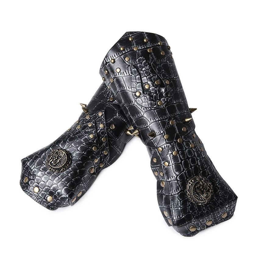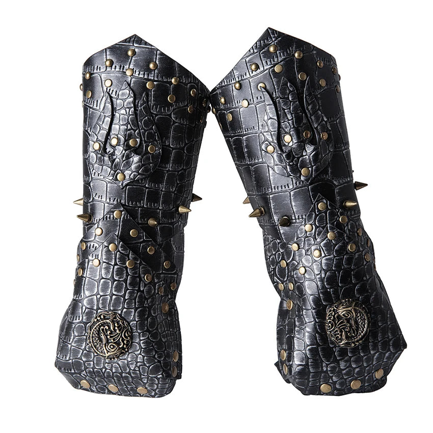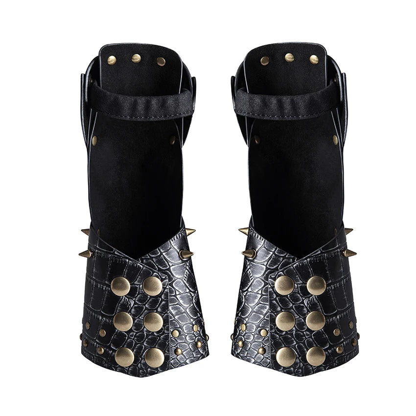 Confectionnés en cuir PU souple et résistants, ces gantelets se ferment par lanières ajustables pour s’adapter à la plupart des avant-bras adultes. Légers mais visuellement puissants, ils se portent par-dessus une chemise, une veste ou un manteau pour renforcer l’effet « armure ».