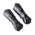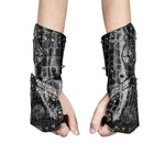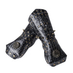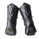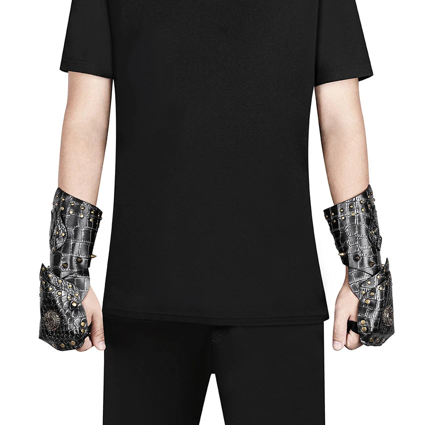 Ajoutez une touche d’acier à vos tenues avec ces gants steampunk façon protège-poignet. Texture cuir reptile, rivets et pointes coniques ton laiton, médaillon gravé : tout évoque l’atelier d’un forgeron cyber-victorien. Idéal pour cosplay, Halloween, conventions ou shootings au style médiéval et punk.
