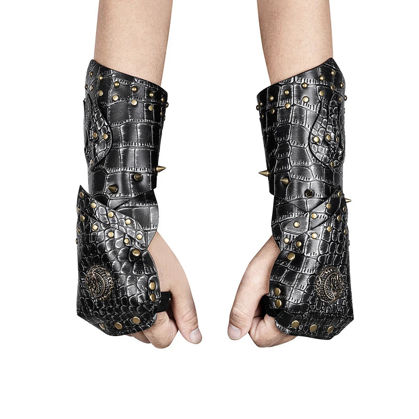 Décor clouté, embossage façon écailles et silhouette fuselée accentuent la ligne de la main. Un accessoire de guerrier au caractère tranché, prêt à compléter vos looks gothiques ou steampunk.