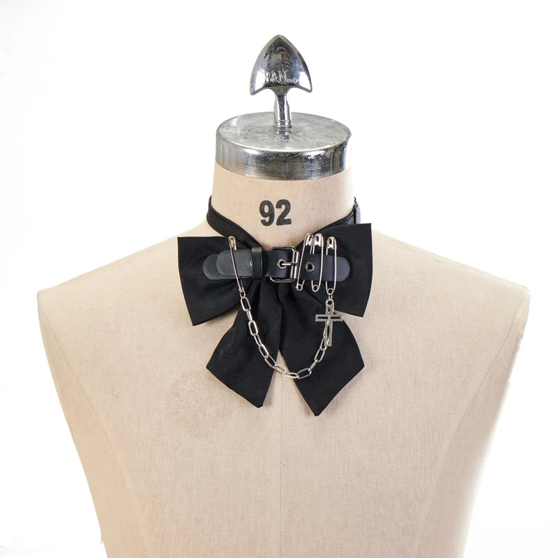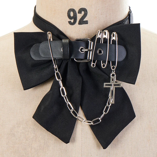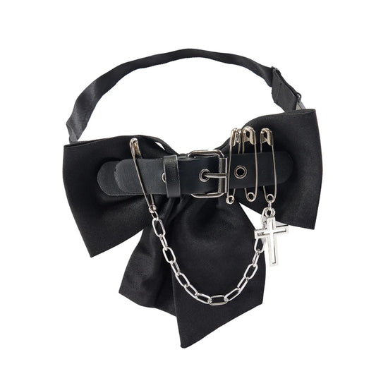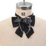 Inspiré des tenues punk/goth Lolita, ce choker combine un large nœud en tissu noir avec des éléments métalliques (chaînes, fermoirs et boucle). Porté au plus près du cou, il crée un contraste fort et apporte une touche « dark elegance » idéale pour les fêtes costumées, les scènes ou les soirées alternatives.