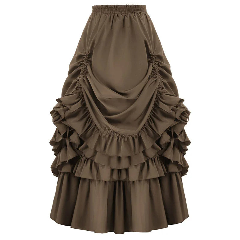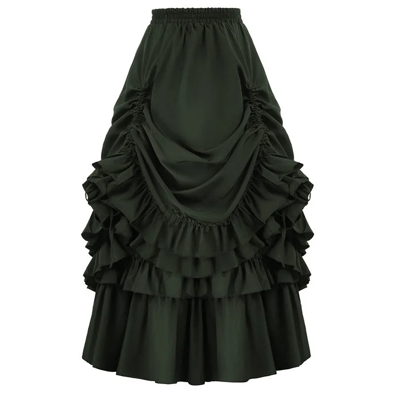 Cette jupe steampunk victorienne déploie un somptueux drapé bouillonné sur l’avant et une cascade de volants façon tournure. Sa matière au fini satiné et ses fronces ultra-généreuses créent une silhouette théâtrale parfaite pour cosplay, pirate, salon gothique ou soirée rétro. Disponible en noir, café et vert foncé, elle sublime un corset ou une blouse en dentelle.
