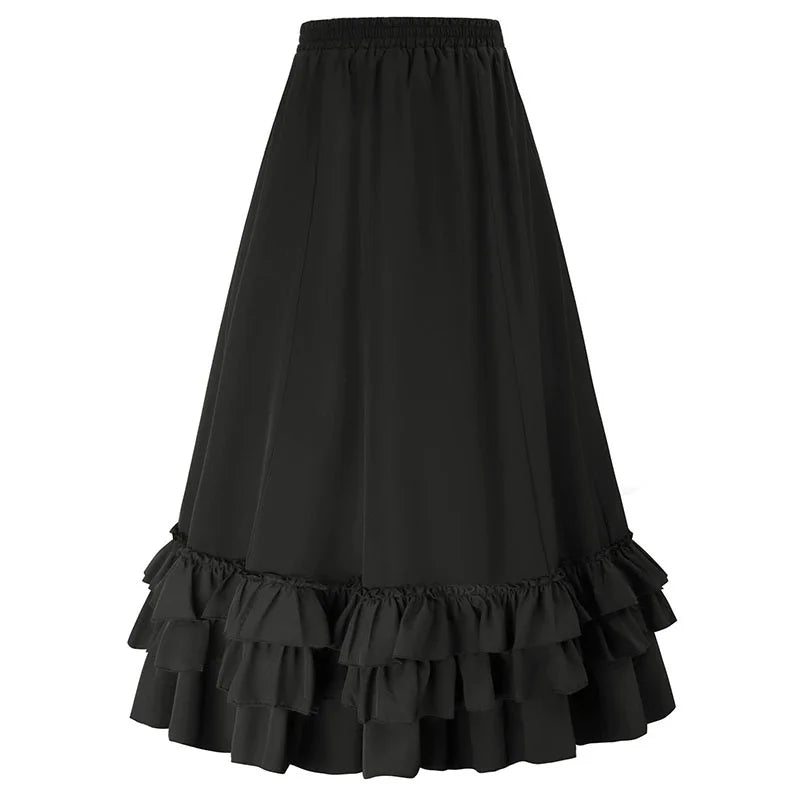 Associez cette jupe gothique à volants à un boléro brodé, un haut victorien ou un corset steampunk : elle devient rapidement la pièce maîtresse de votre tenue.