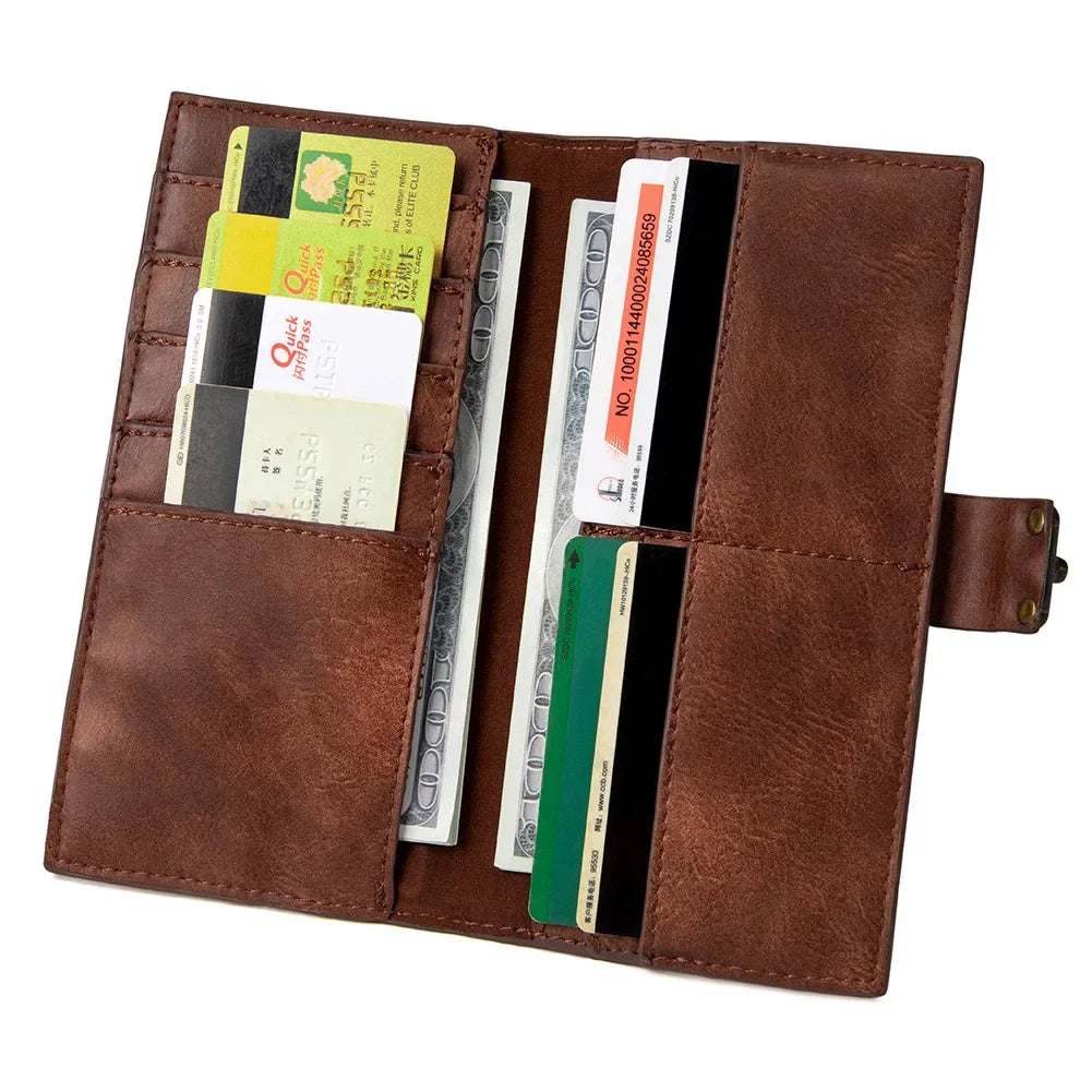 Extérieur en PU (simili-cuir), doublure polyester, couture sellier et quincaillerie ton laiton : un portefeuille vintage solide et léger (≈ 0,20 kg), taillé pour vous suivre partout.
