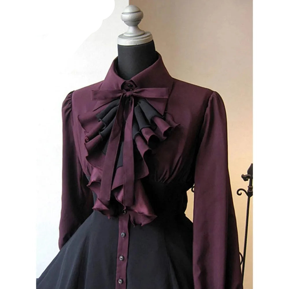 Avec son haut bordeaux et sa jupe à volants noire, cette robe victorienne bordeaux et noire réinvente les codes du gothic Lolita. Le col nœud (lavallière) et la patte de boutonnage structurent le buste, tandis que la taille empire dessine une ligne de robe de bal courte, virevoltante, idéale pour cosplay, salon steampunk ou tea party.