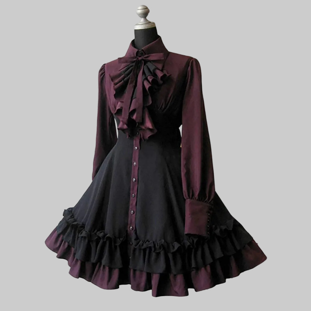 Robe victorienne bordeaux et noire — lavallière, volants et esprit Lolita