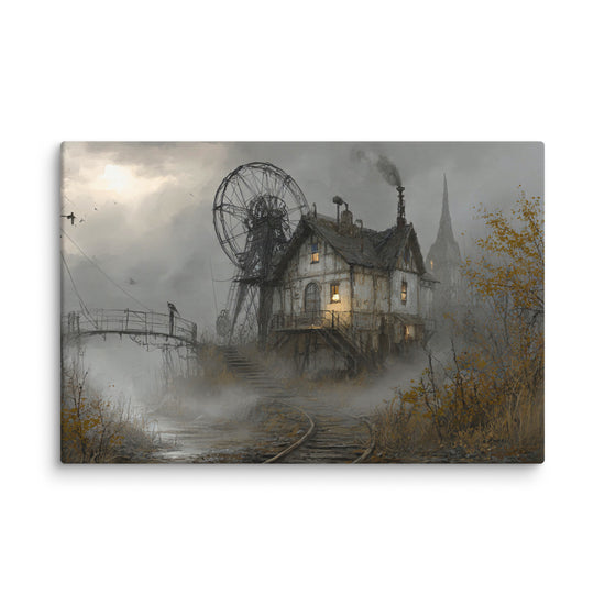 Plongez au cœur d’un paysage steampunk enveloppé de brume : un hameau oublié, ses rails rouillés menant à une maison aux lampes allumées, une grande roue mécanique dressée dans le ciel gris. Cette toile capture l’atmosphère d’un village perdu où l’horlogerie, la fumée et le métal se mêlent aux herbes sauvages – un décor rétrofuturiste qui transforme instantanément votre mur en scène de film.