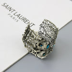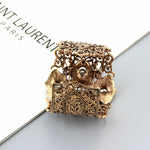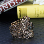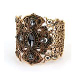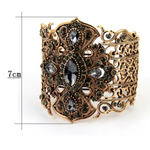 Orné d’un motif ajouré aux volutes baroques, ce bracelet manchette vintage fait rayonner un cristal gris au cœur d’un décor finement travaillé. Son plaqué or antique souligne un relief ciselé qui évoque l’art d’atelier des bazars d’Istanbul. Une pièce au style bohème et ethnique qui habille le poignet avec assurance, entre raffinement rétro et tempérament moderne. Idéal pour les tenues de fête, un mariage ou un dîner, ce bijou transforme un simple geste en signature.