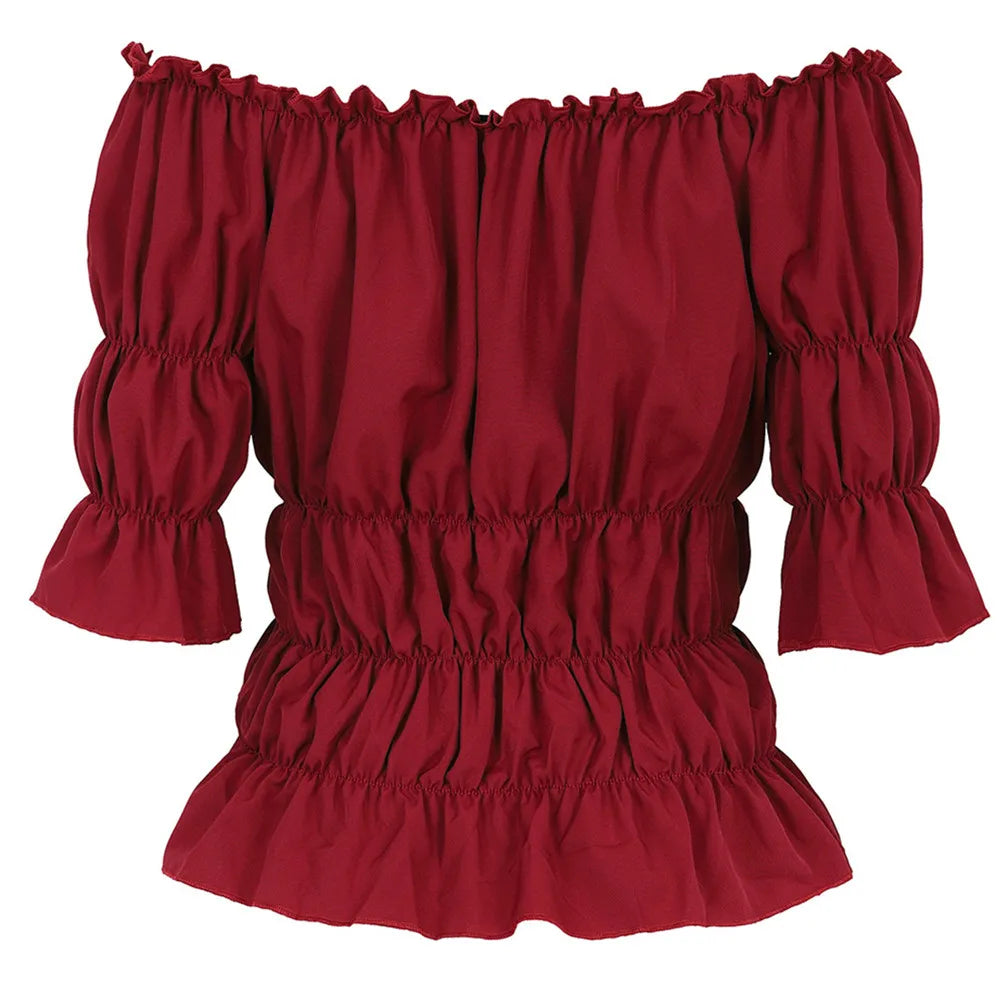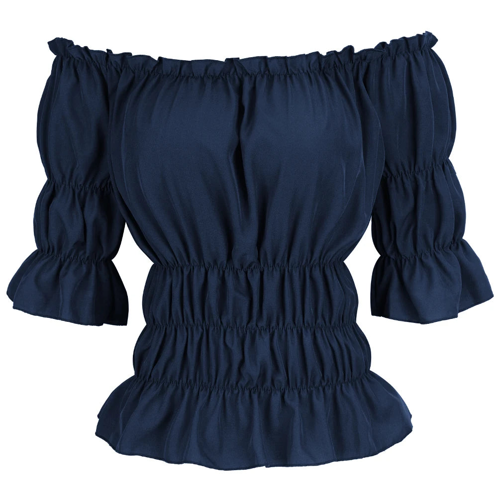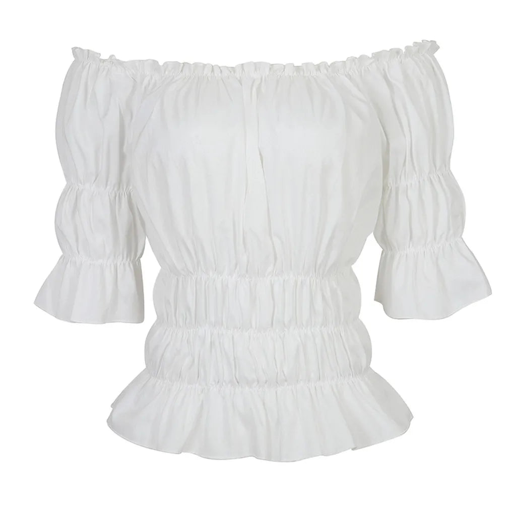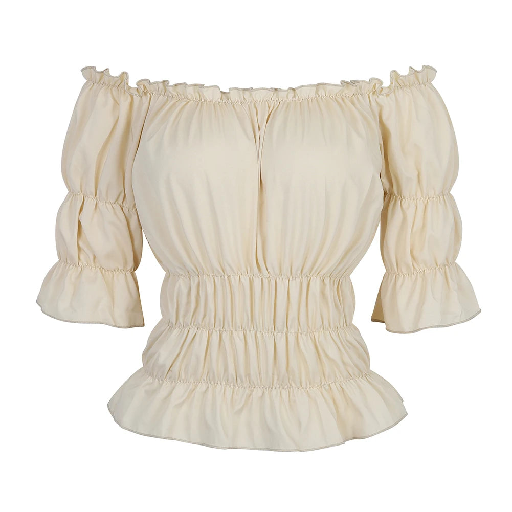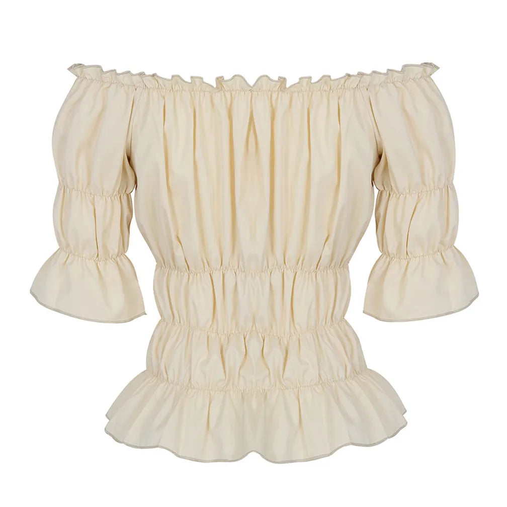La Blouse aux Épaules Dénudées dans un style vintage léger et élégant.