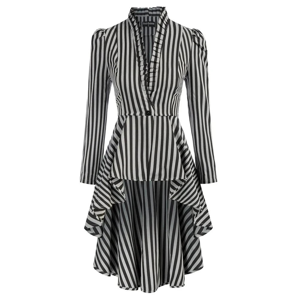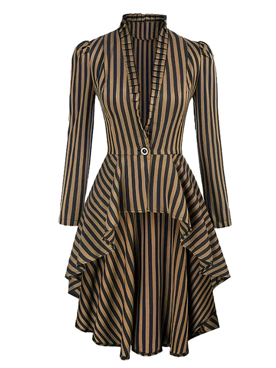 Ce manteau steampunk femme structure la taille et allonge la silhouette grâce à son ourlet haut-bas théâtral. Le col montant s’ouvre sur une encolure en V élégante, tandis que les manches bouffantes signent une présence victorienne affirmée. Son motif rayé noir-doré capte la lumière et fait de cette veste gothique la pièce forte idéale pour le club, la fête ou un look quotidien audacieux.