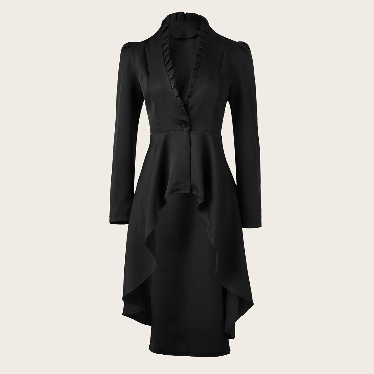 Le buste cintré affine, un bouton souligne la taille et les pans asymétriques créent du mouvement à chaque pas. Confectionné en polyester, le tissu conserve un tombé net et se froisse peu : parfait pour les sorties, le cosplay victorien ou Halloween.