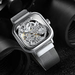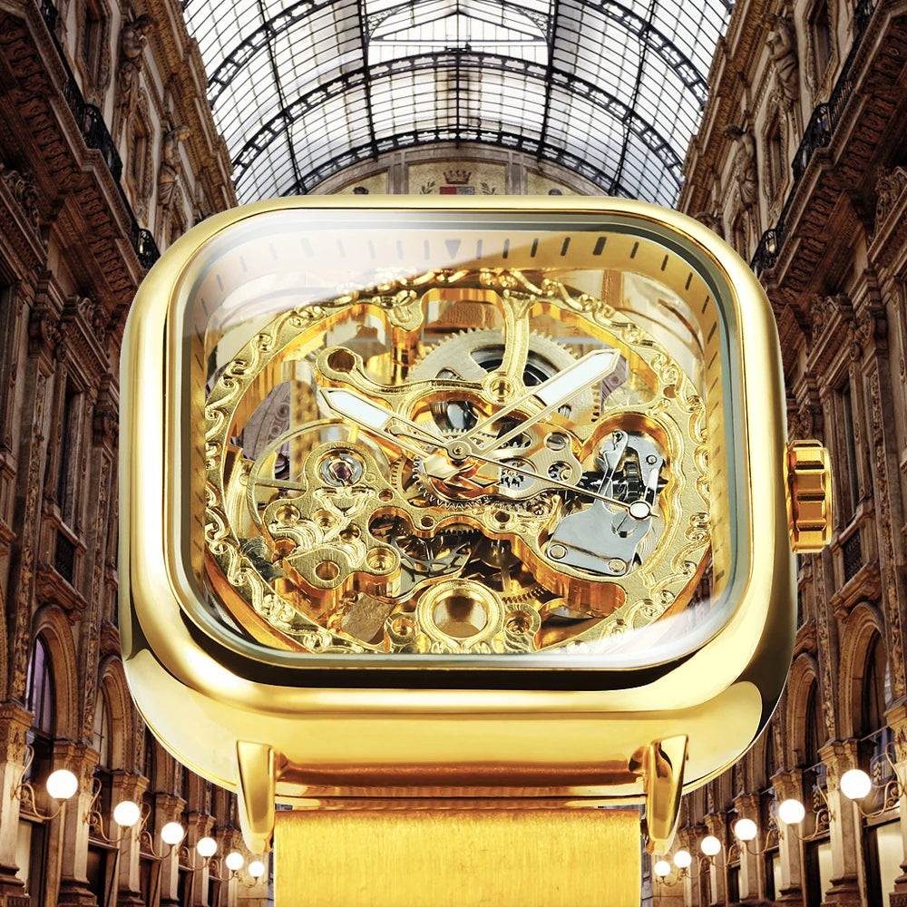 Inspirée des années 30 et de l'esthétique Art Déco, cette montre squelette mécanique vous dévoile ses pièces en mouvement pour un spectacle fascinant. Admirez son cadran carré distinctif et laissez-vous transporter par l'alliance subtile du style steampunk et de l'Art Déco berlinois.