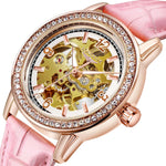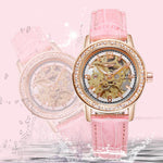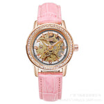Voir la vie en rose, c’est porter au poignet un ballet d’engrenages dorés sous une glace Hardlex. La lunette sertie de zircons capte la lumière, le boîtier ton or rose souligne la délicatesse du poignet, et le bracelet en cuir rose offre un confort douillet. Cette montre squelette révèle son âme : un mouvement automatique qui pulse au rythme de vos gestes — pas de pile, juste la poésie du temps.
