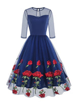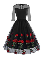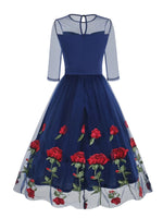 Cette magnifique robe vintage fleurie incarne la grâce et la sophistication. La robe présente un buste ajusté en tissu de haute qualité, tandis que les manches mi-longues en dentelle transparente ajoutent une touche de sensualité et de mystère. La jupe ample en tulle est ornée de délicates broderies florales rouges, créant un contraste saisissant qui attire immédiatement le regard. Disponible en trois couleurs élégantes : noir, bleu et blanc.