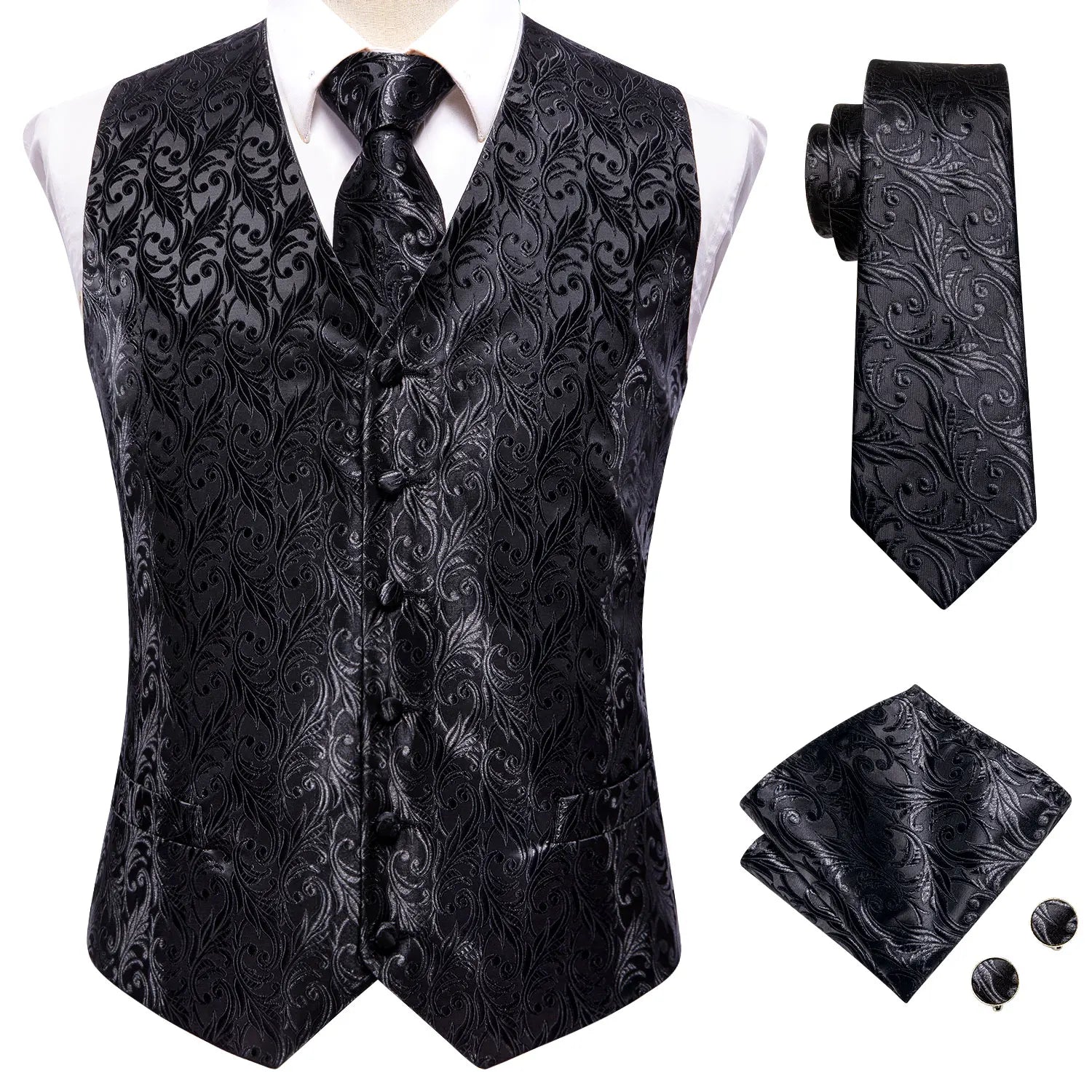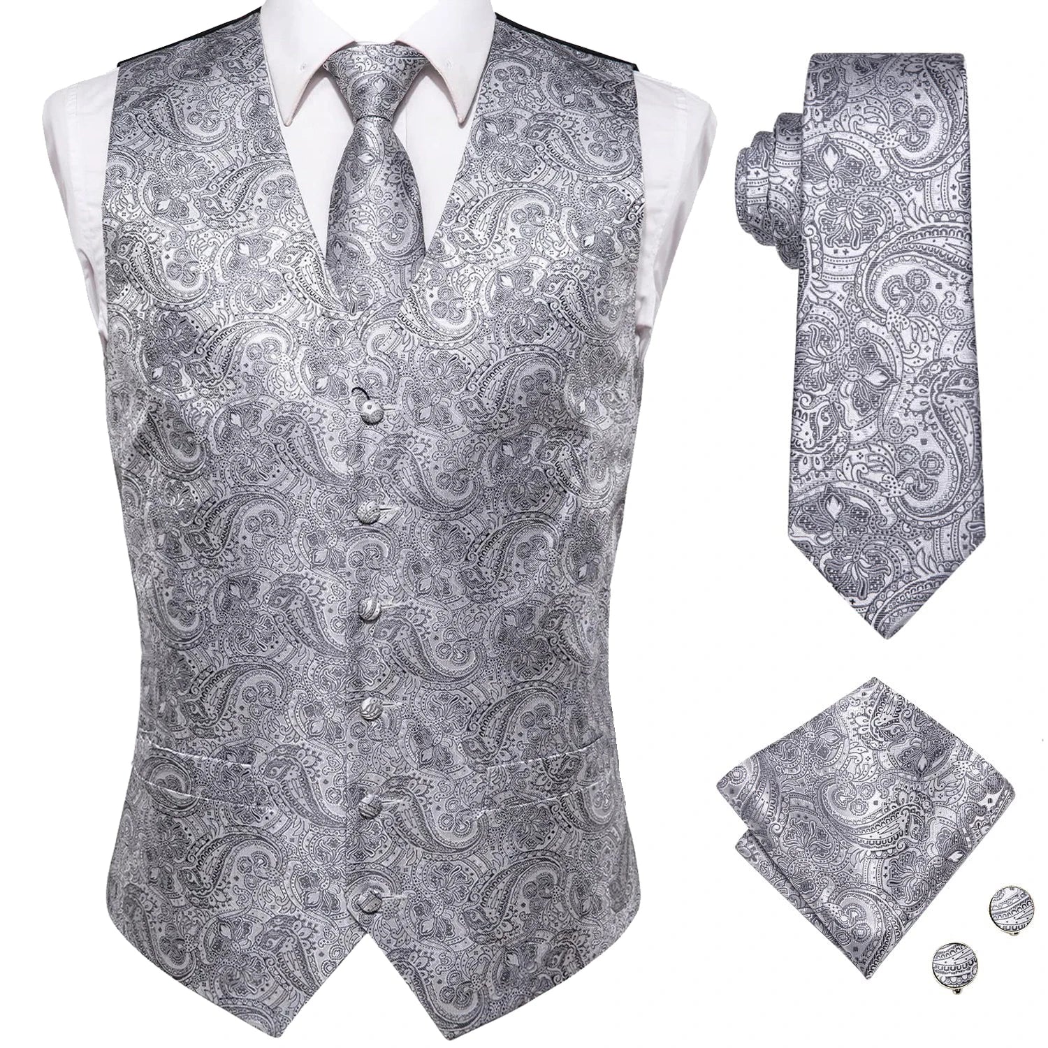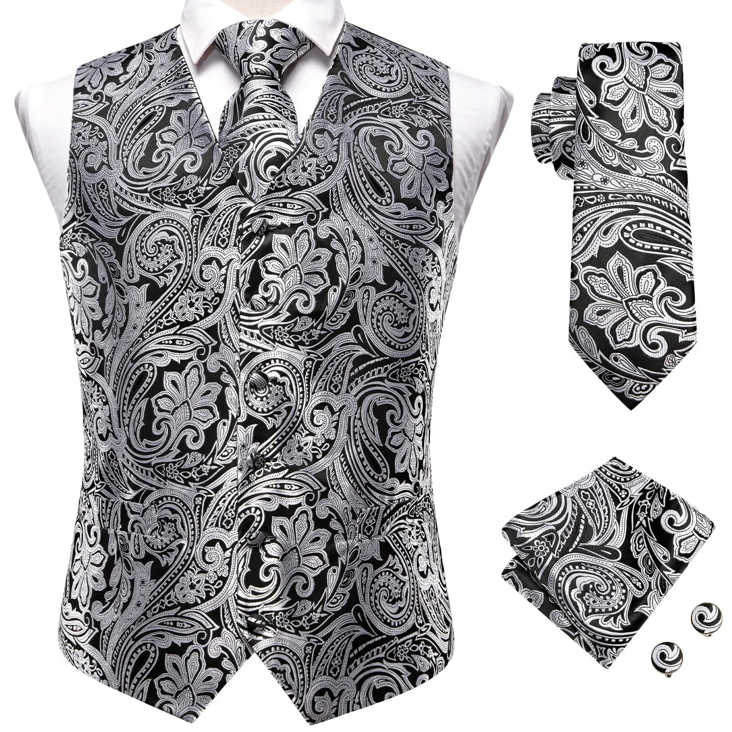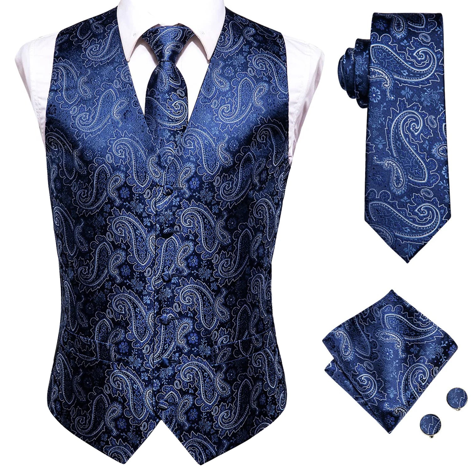 - Type : Gilet sans manche homme, cravate, boutons de manchettes et mouchoir de poche