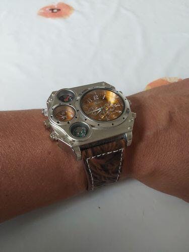 Le look rétro-futuriste d'une montre steampunk est respectée. Avec son bracelet en cuir et ses multiples cadrans elle a quelque chose d' excentrique ... ce n'est pas une apple watch mais une tesla watch !