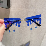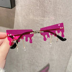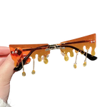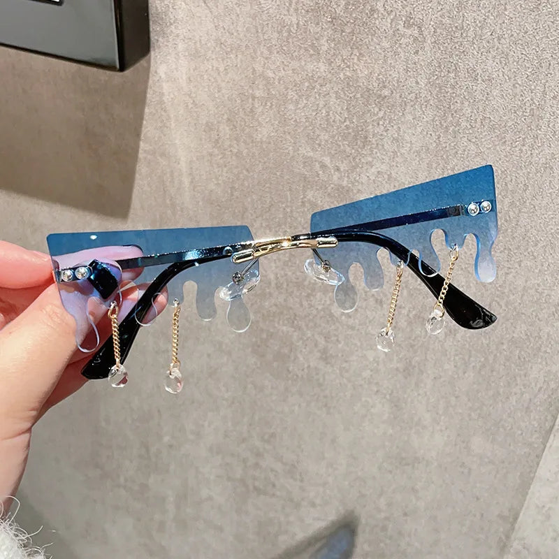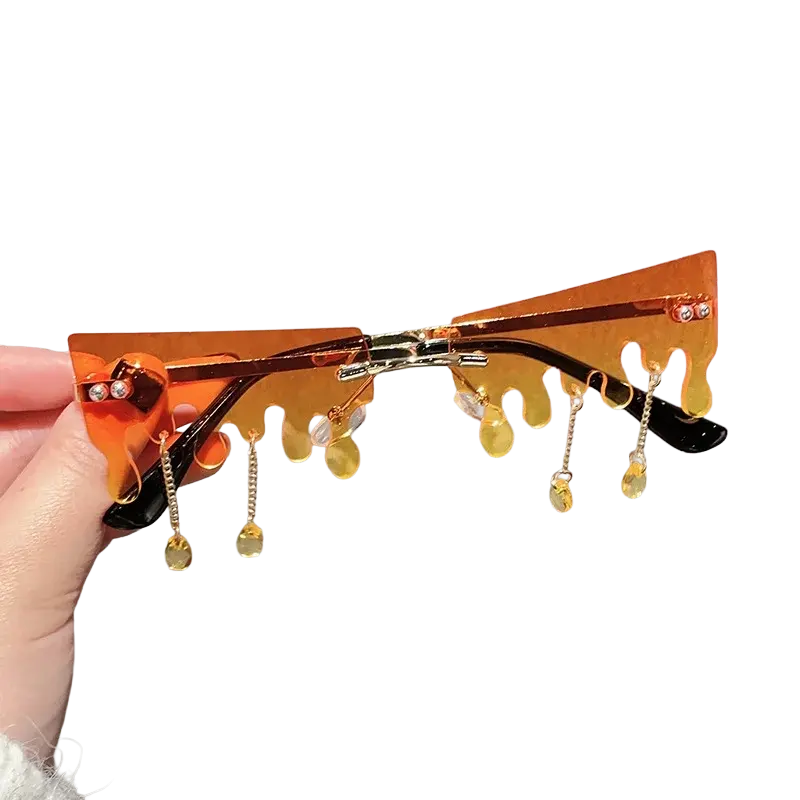 Ces lunettes au design « neige fondante » transforment le regard en paysage fantasque : les bords semblent couler comme de la glace au soleil, des pendentifs oscillent au rythme de vos pas, et la monture disparaît pour laisser place à l’essentiel. Un accessoire de fête qui assume un style punk sans compromis, parfait pour la scène, les soirées à thème ou un streetwear qui ose.