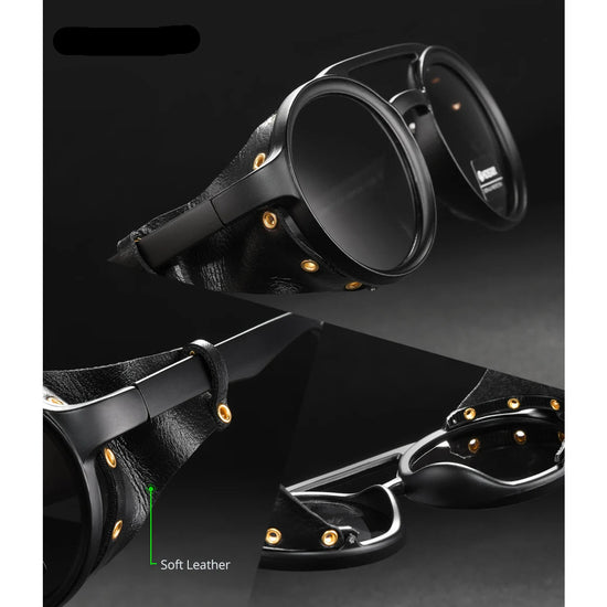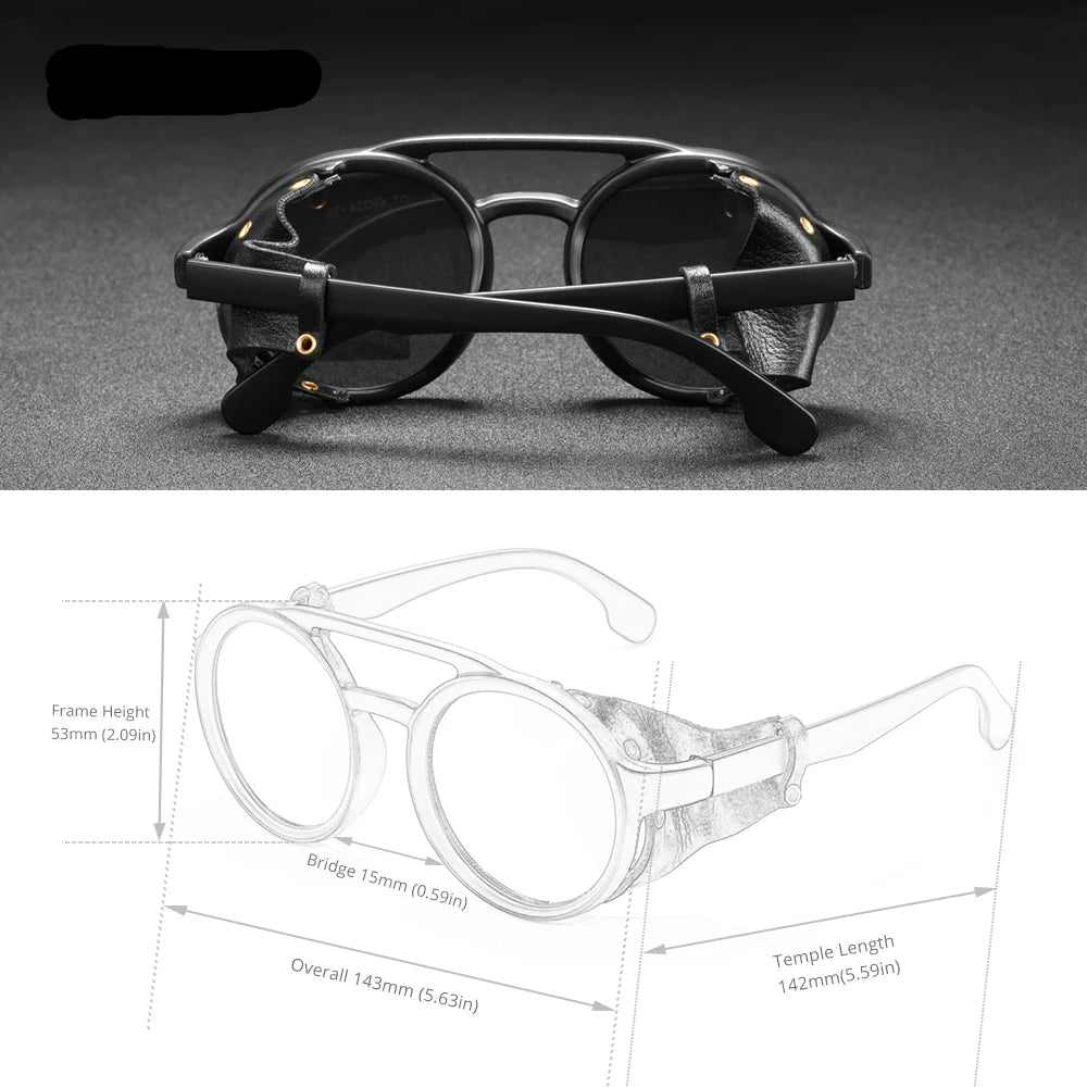 Ces Lunettes réinterprètent la lunette ronde avec un double pont signature et des boucliers latéraux en cuir. Leur look vintage/steampunk convient aux hommes et aux femmes qui cherchent une monture à la fois expressive et facile à porter au quotidien.