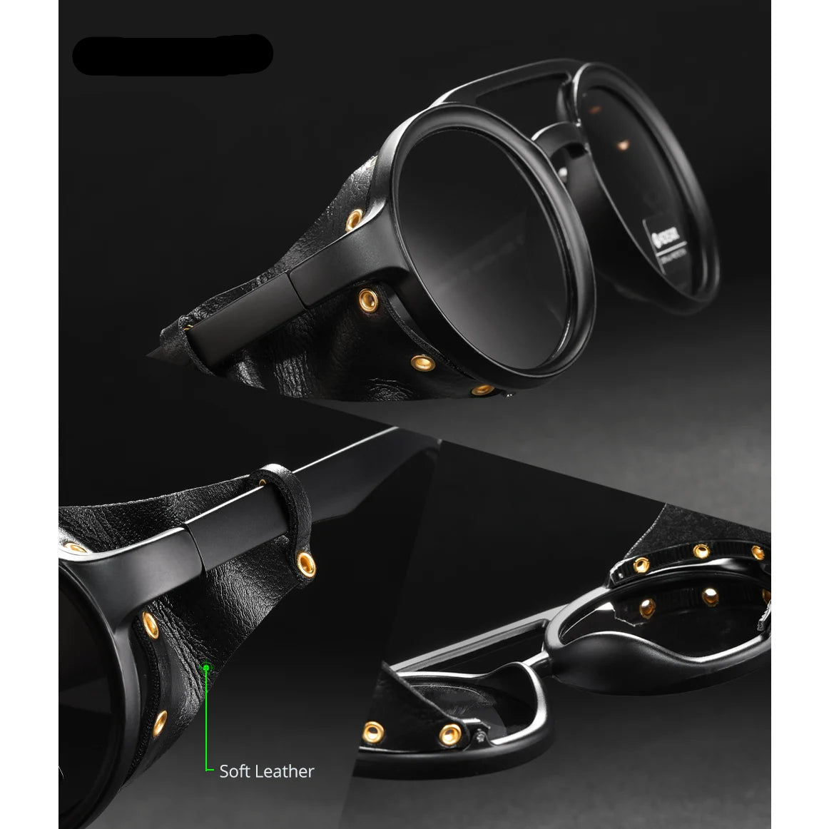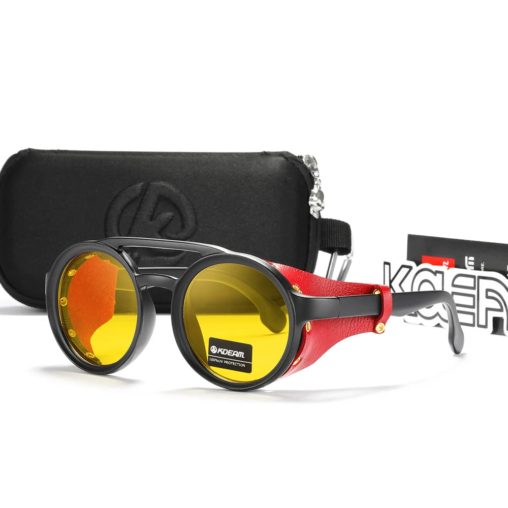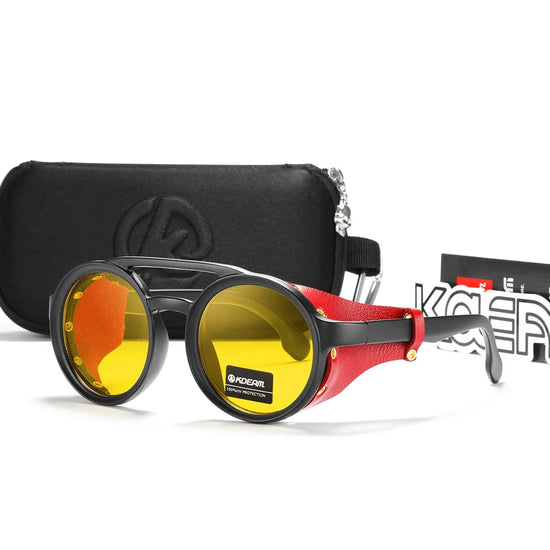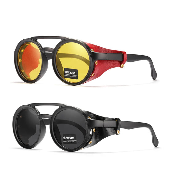Cadre en polycarbonate avec boucliers cuir pour renforcer la protection latérale et le caractère de la monture. Plusieurs finitions disponibles (noir brillant, noir mat, marron, jaune), toutes en verres non miroir pour un rendu sobre et élégant.
