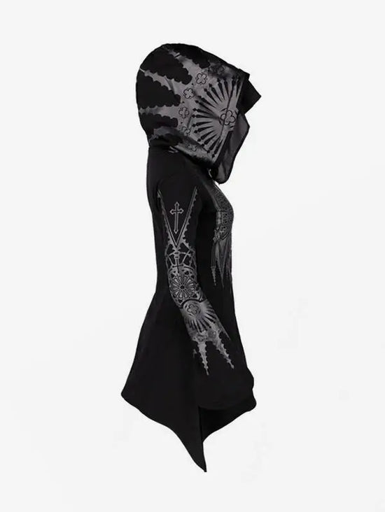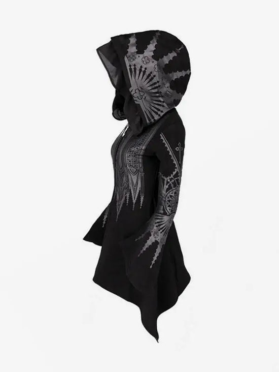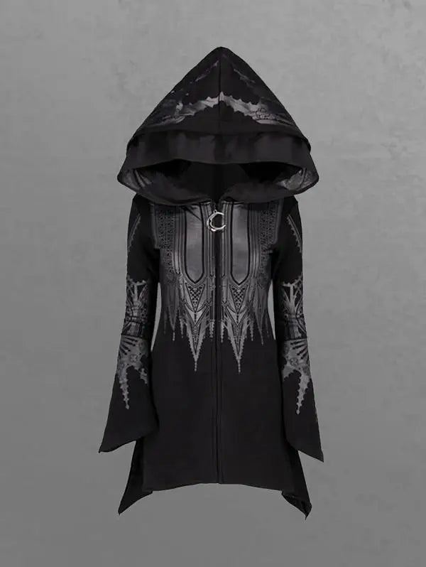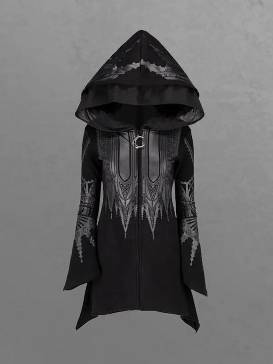 Élégant, mystérieux et terriblement flatteur, ce manteau à capuche associe un imprimé floral croisé à une coupe asymétrique et des manches évasées. Sa fermeture éclair frontale permet un enfilage facile, tandis que la matière extensible offre confort et tenue toute la journée. Parfait pour la mi-saison, du printemps à l’automne.
