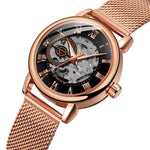 The Skeleton dial with a sleek design highlights the rose gold color and harmonious design.