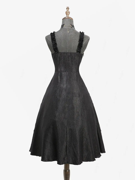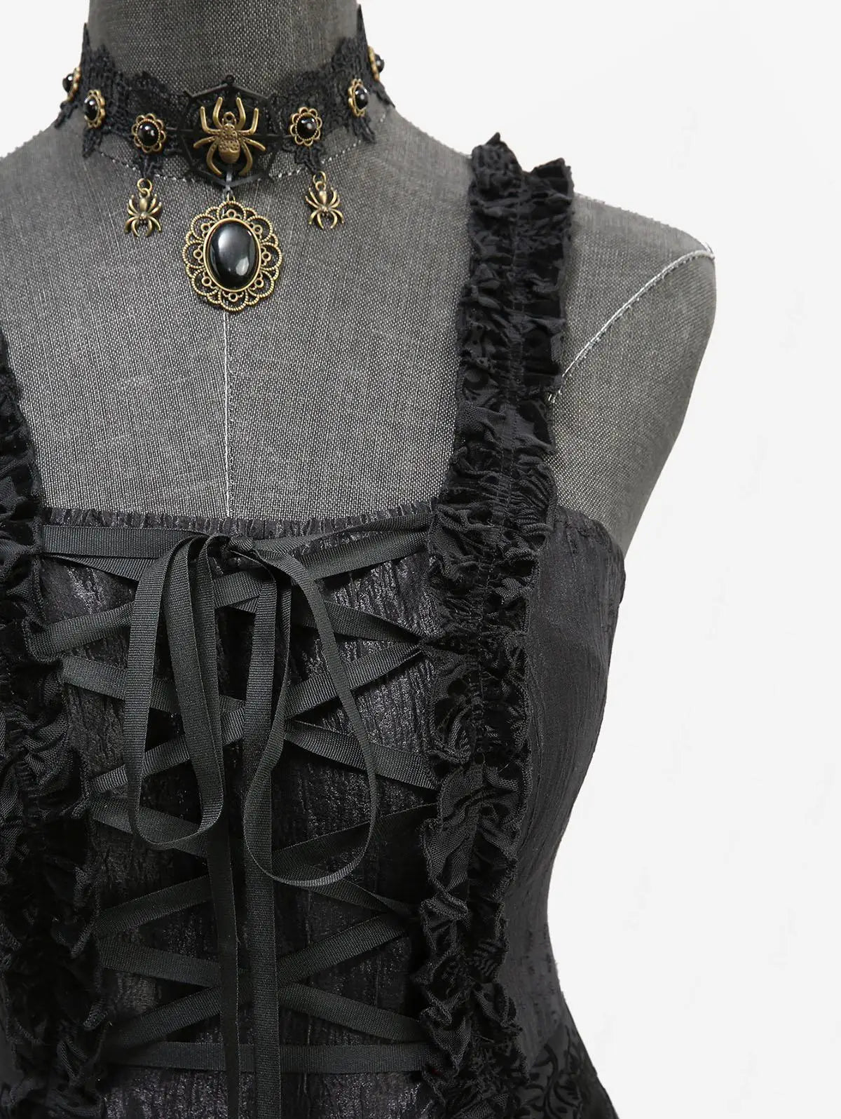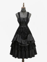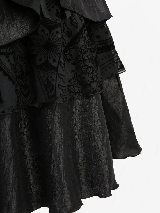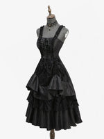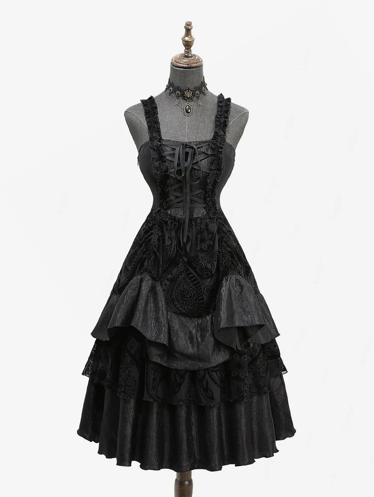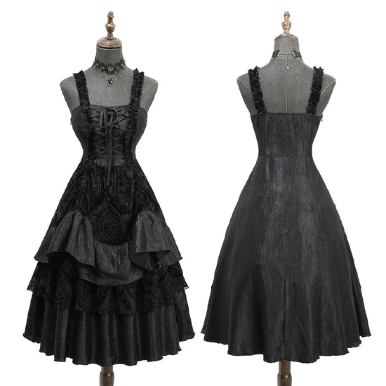 Sophistiquée et théâtrale, la Robe Gothique « Nocturne à Volants » sculpte une silhouette A-line flatteuse grâce à son jupon midi à volants superposés et son laçage corseté sur le buste. La maille florale flocquée apporte du relief, tandis que les bretelles et le dos nu soulignent l’allure rétro-romantique. Une pièce idéale pour vos looks goth, soirées cocktail, festivals ou shootings.