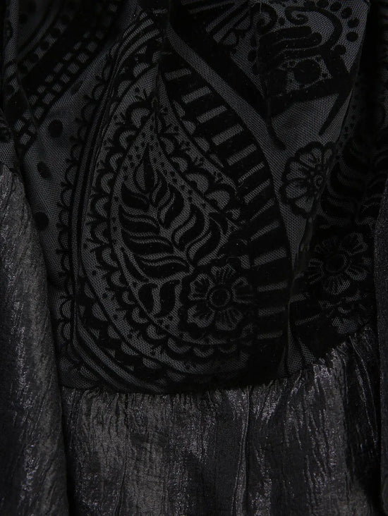 - Allure gothique classique : maille florale flocquée, noir profond, finitions soignées.