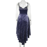 Cette robe gothique violette associe la douceur du velours au dessin délicat de la dentelle noire. Son V-cou et ses fines bretelles spaghetti soulignent le port de tête, tandis que la coupe A-line à taille empire sculpte une silhouette élancée. L’effet patchwork velours/dentelle crée un relief somptueux, parfait pour soirée alternative, cosplay, concert ou Halloween.