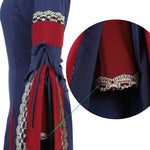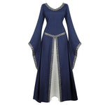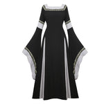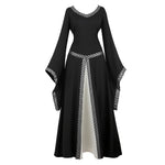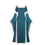 Conçue pour les royaumes imaginaires, cette robe médiévale elfique déploie une jupe ample longueur cheville animée par des panneaux contrastés. Le col rond encadre le port de tête tandis que les manches flare façon trompette dessinent une silhouette aérienne. Les lacets décoratifs renforcent l’esthétique Renaissance / gothique, idéale pour cosplay, festival historique ou cérémonie à thème.