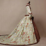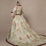La robe victorienne longue marron déroule une traîne soyeuse couleur cacao, bordée d’un manteau clair aux arabesques fleuries. Sa taille empire, son col carré et ses manches évasées dessinent une ligne majestueuse, parfaite pour un bal costumé, un cosplay victorien ou une ambiance gothique / steampunk. Le panneau central satin marron contraste avec l’imprimé floral et magnifie la longueur maxi pour une prestance de reine.