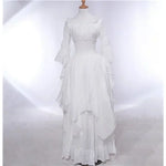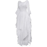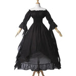 Cette robe victorienne médiévale étire une jupe ample à longueur du plancher et révèle une encolure sans bretelles façon Bardot. La taille empire souligne la silhouette tandis que les manches papillon et les volants (ruffles) animent le mouvement. En noir profond ou en blanc immaculé, son style gothique romantique convient aux cosplays, bals, festivals historiques et shootings.