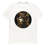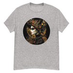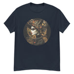 This steampunk t-shirt perfectly embodies the essence of steampunk style with a unique and elegant design. The central motif features a gothic woman adorned with lace and mechanical details, evoking the Victorian era and the industrial revolution. The dark colors and golden gears bring a touch of mystery and sophistication to this garment.