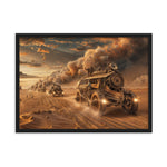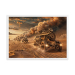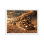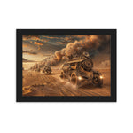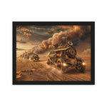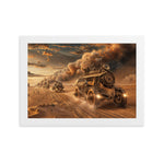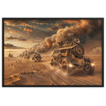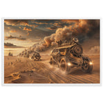 Every detail of this painting, from the vehicles dominating the sand dunes to the explorers searching for survival, is a celebration of the worlds of Jules Verne and HG Wells. The bronze and brass tones, mixed with the desert browns, evoke the nuances of steampunk literature, creating an aesthetic that is both nostalgic and forward-looking.