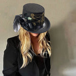 Sur le côté, de somptueuses décorations plumes d'halloween noires s’épanouissent avec élégance, apportant mouvement et mystère à votre allure. Légèrement aériennes, elles contrastent avec la rigidité noble du cylindre et captent la lumière dans une danse subtile.