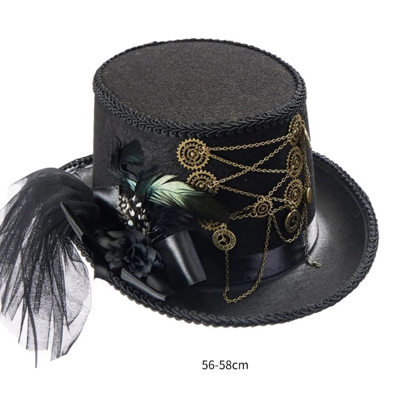 Conçu en polyester de qualité, ce chapeau allie légèreté et tenue impeccable. Son tissage soigné garantit un port confortable tout au long de la soirée, que ce soit pour une fête costumée, un bal steampunk ou un événement à thème victorien.